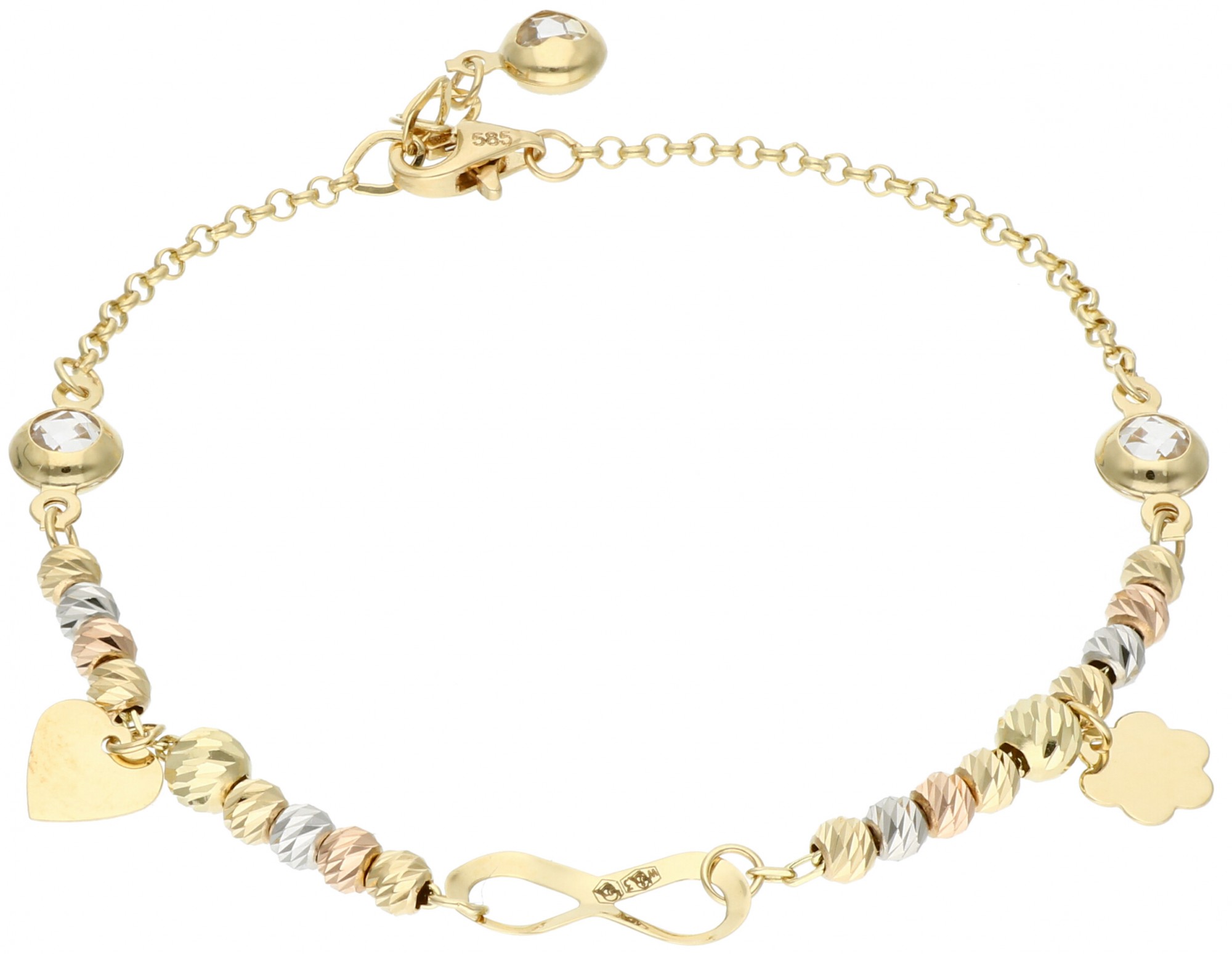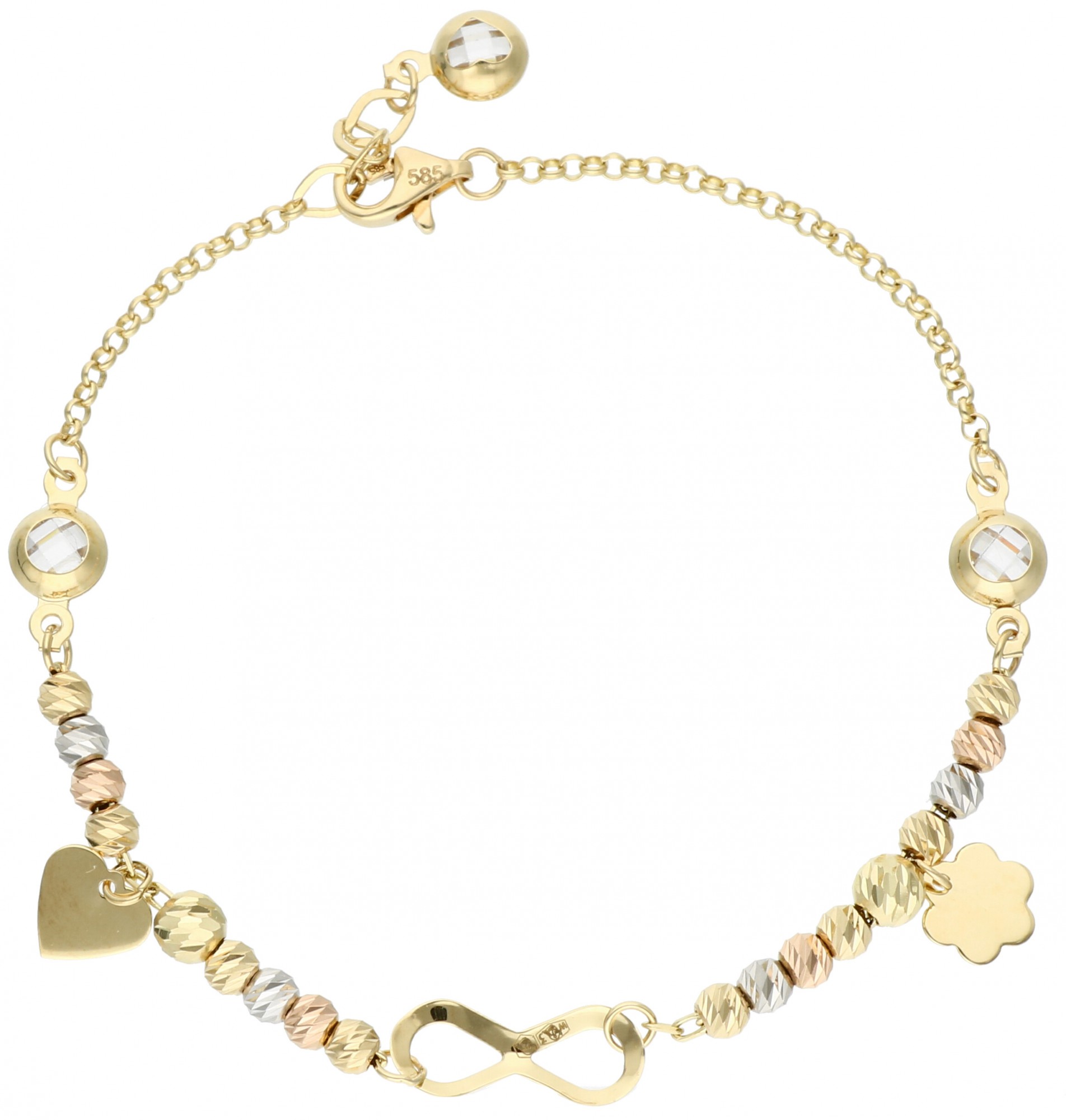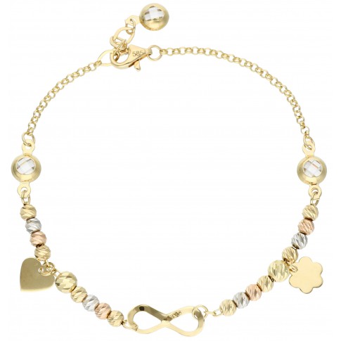 Ta bransoletka została stworzona dla kobiet, które lubią intrygującą biżuterię. Na 19 cm łańcuszku dużo się dzieje! Mamy znak nieskończoności, połyskujące cyrkonie, koraliki z trzech kolorów złota i zawieszki. To dodatek, który wzbudza pozytywne emocje i potrafi poprawić samopoczucie swojej właścicielce. Może Ty nią zostaniesz?