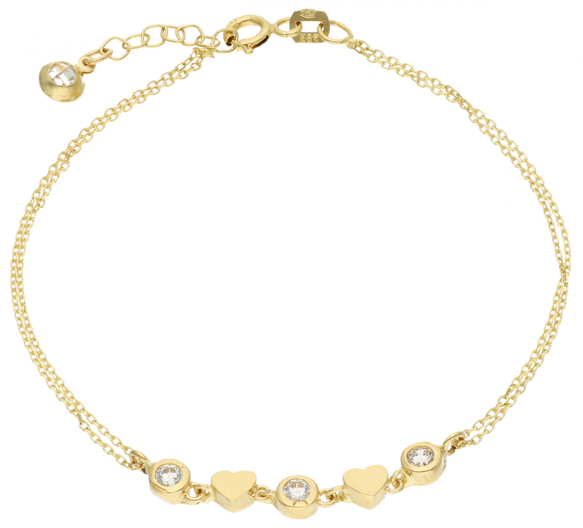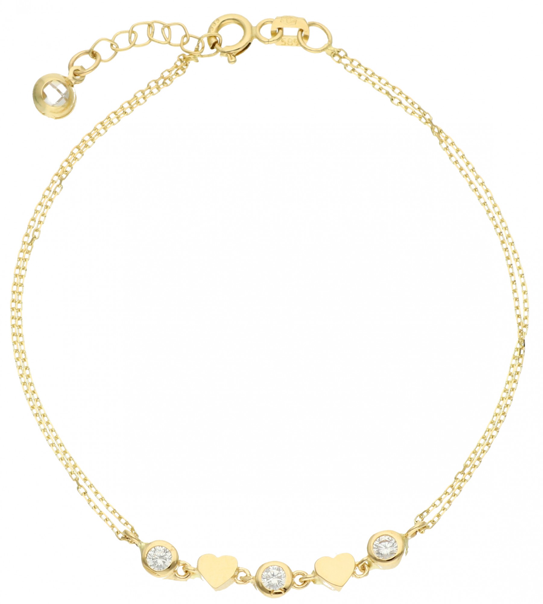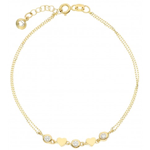 Delikatna bransoletka z serduszkami i bezbarwnymi cyrkoniami to wymarzony dodatek na każdą okazję! Subtelna, niezwykle kobieca biżuteria została w całości wykonana z żółtego złota (próba 585), a dzięki regulowanemu zapięciu z łatwością dopasuje się do nadgarstka swojej właścicielki. Ozdoba dodaje romantycznego charakteru każdej stylizacji, podkreślając klasę swojej właścicielki. Jest idealnym wyborem na prezent dla kogoś wyjątkowego!