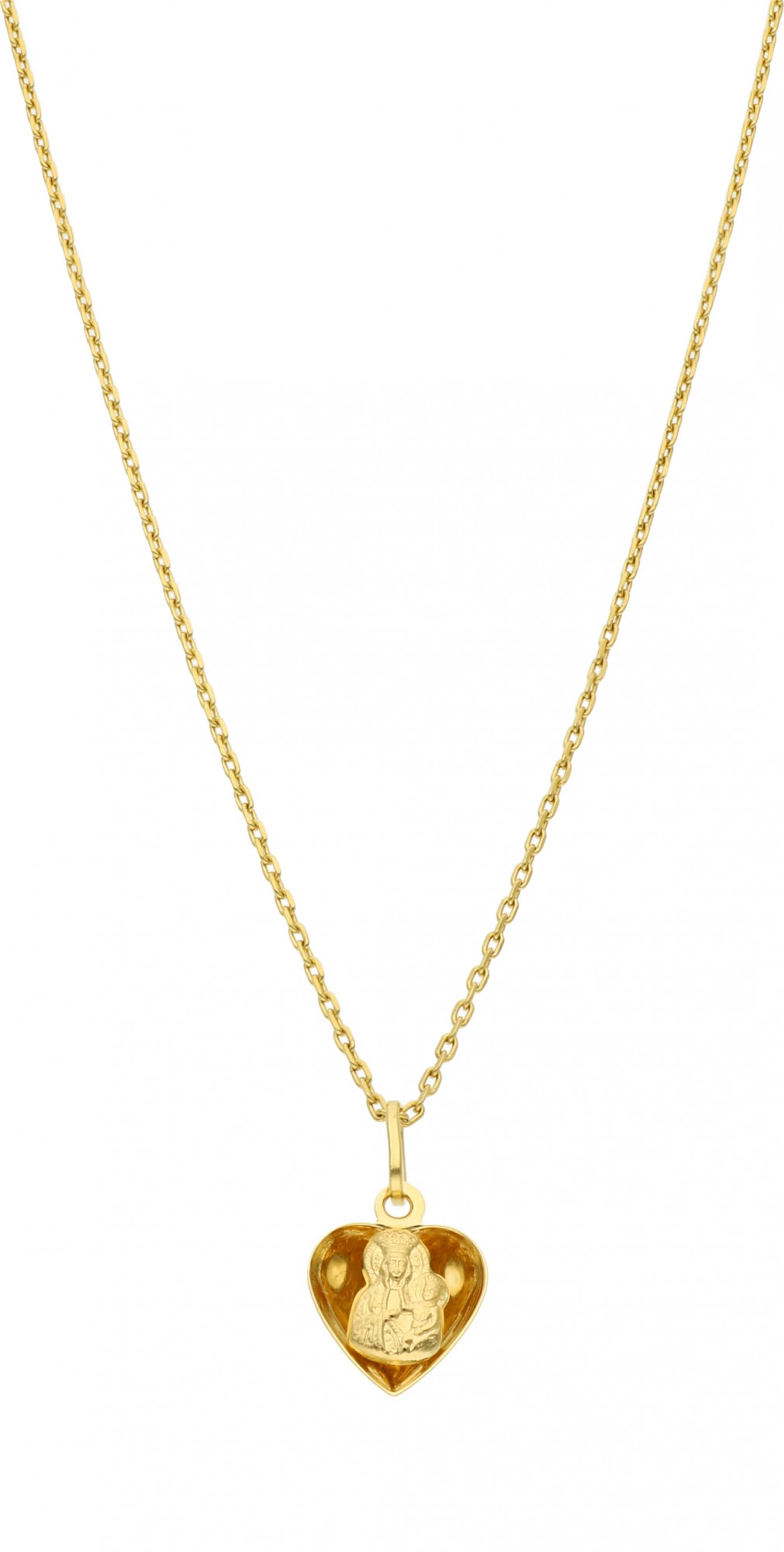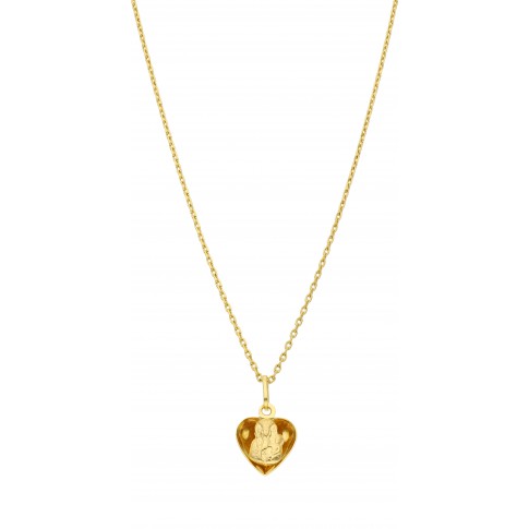 Medalik w kształcie serca zwraca uwagę niepowtarzalnym projektem i wysoką jakością wykonania. Zawieszka z żółtego złota (próba 585) przedstawia wizerunek Matki Boskiej z Dzieciątkiem. Stanowi piękny symbol wiary, może także być prezentem i pamiątką przyjęcia sakramentów świętych. Dzięki uniwersalnemu, subtelnemu wyglądowi, medalik może być noszony każdego dnia.