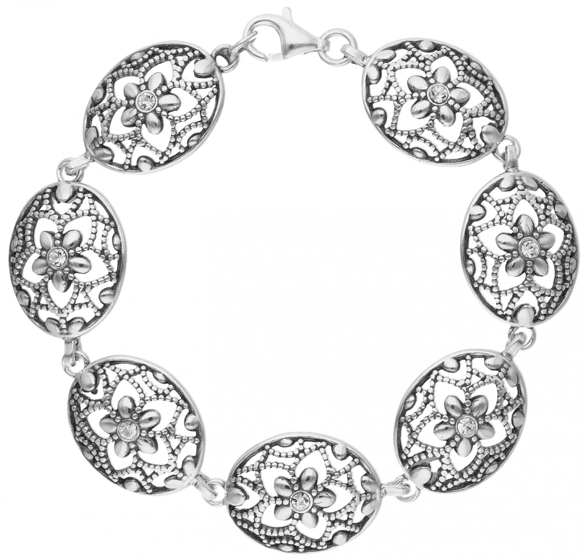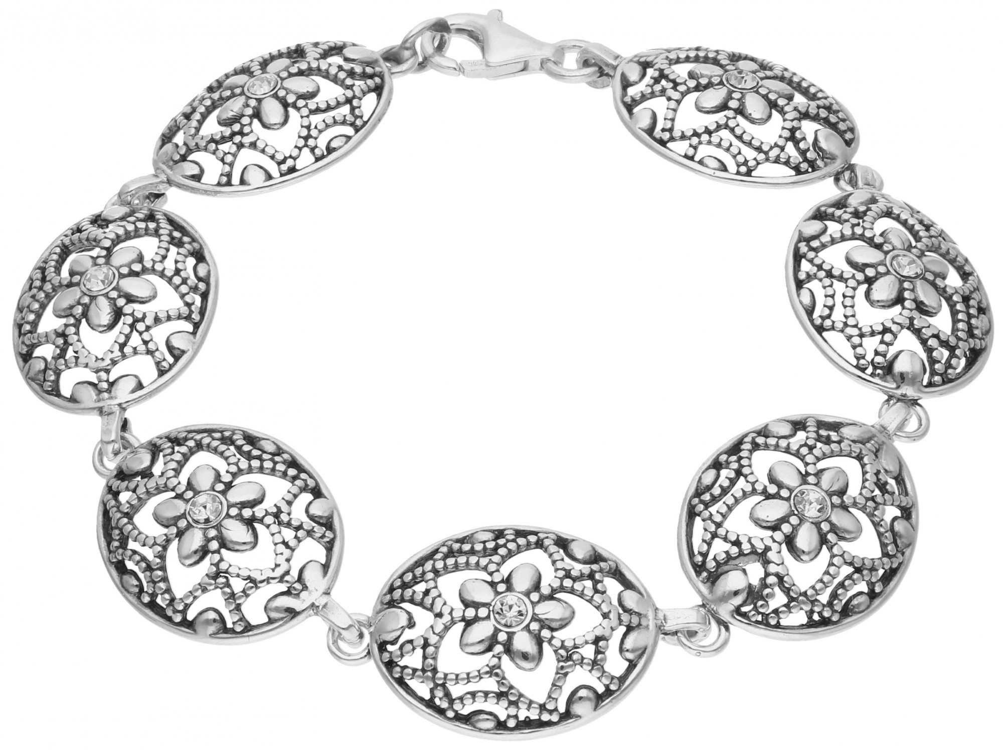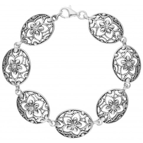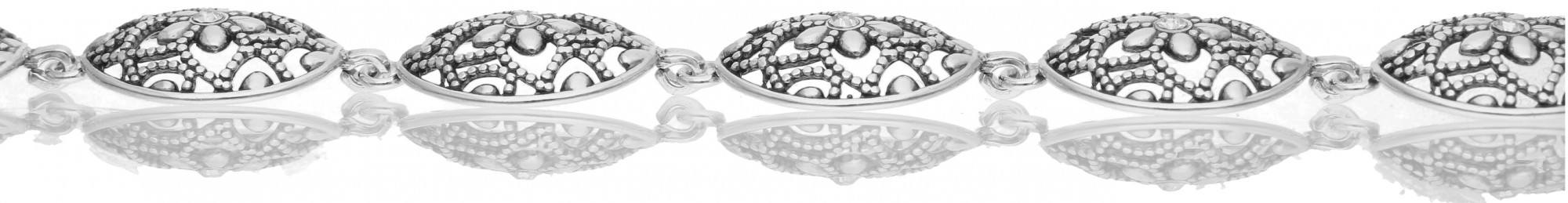 Bransoletka wykonana z ażurowych modułów zachwyca precyzją wykonania i roślinnymi motywami. To niezwykle kunsztowny dodatek dla koneserek, które zamiast minimalizmu wolą własny styl i nieszablonowe dodatki. Ozdoba świetnie wygląda w zestawieniu z eleganckimi i swobodnymi stylizacjami, możesz także zestawić ją z outfitami boho czy vintage.