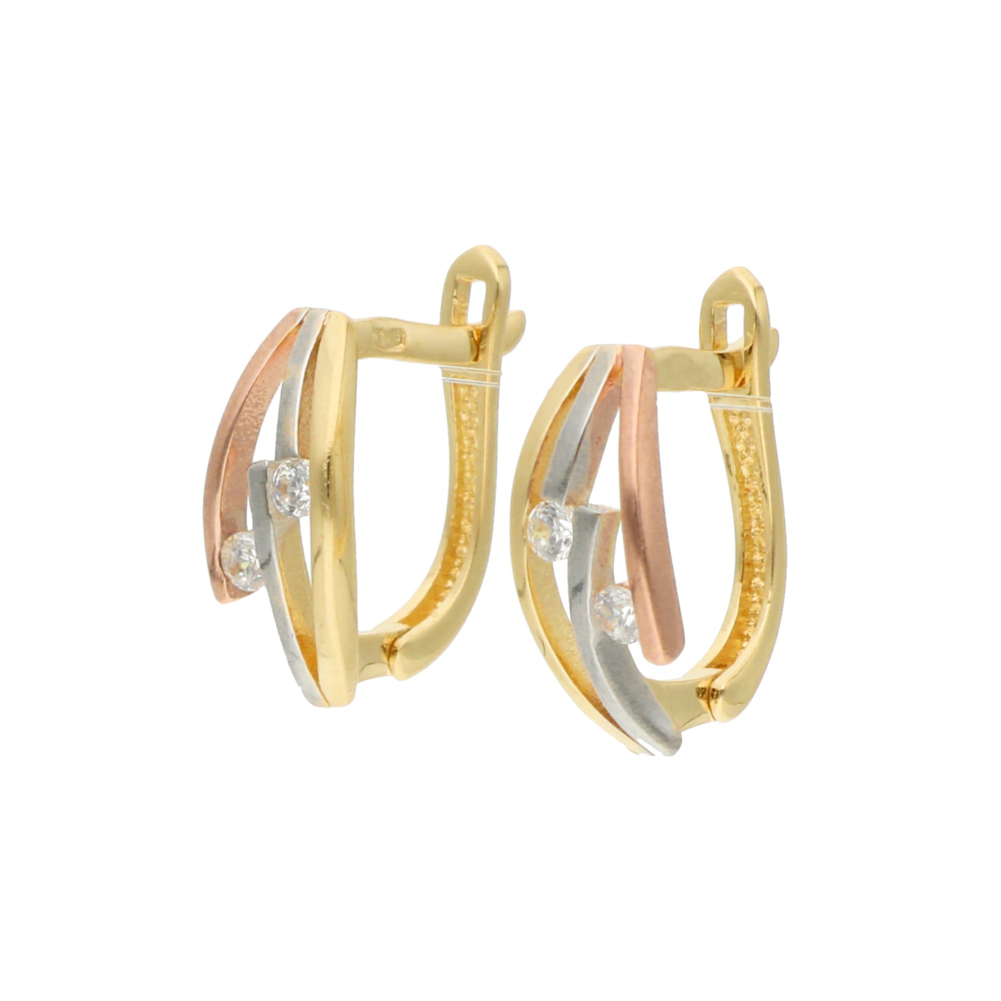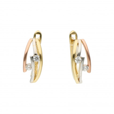 Intrygujący projekt kolczyków ze złota w trzech odcieniach, ozdobiony bezbarwnymi cyrkoniami, to bardzo oryginalna biżuteria z wyższej półki. Subtelny dodatek przyciąga wzrok i doskonale uzupełni nowoczesne, eleganckie oraz minimalistyczne stylizacje.