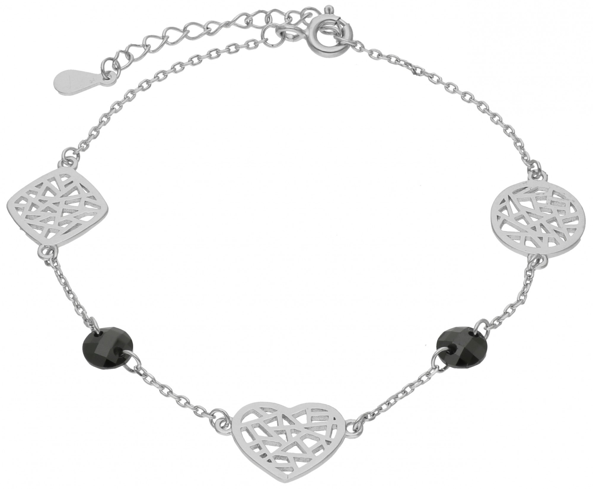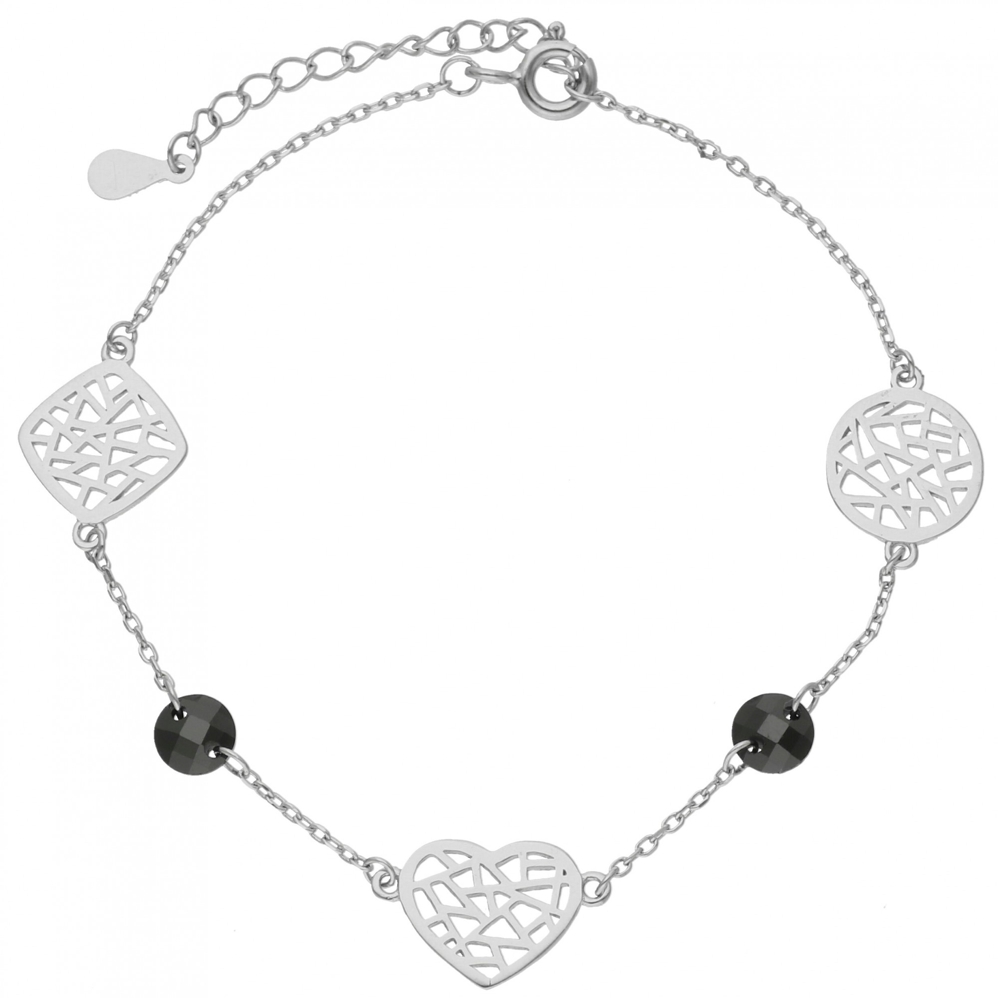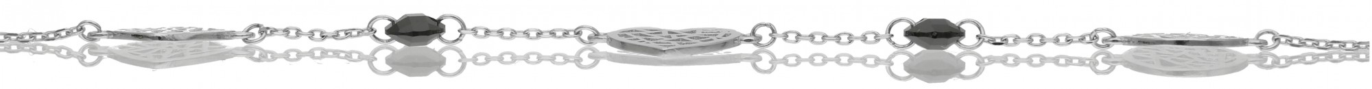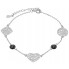 Delikatna bransoletka typu celebrytka została ozdobiona ażurowymi dodatkami i czarnymi koralikami. Pięknie komponuje się z wiosennymi i letnimi stylizacjami, podkreślając ich lekkość i niewymuszony szyk. To wymarzony dodatek na wakacyjne wojaże, spotkania z rodziną i przyjaciółmi, a także do pracy czy na randkę. Bransoletka jest subtelna i lekka, więc wygodnie się ją nosi, a regulowane zapięcie sprawia, że bez problemu dopasuje się do każdego kobiecego nadgarstka.