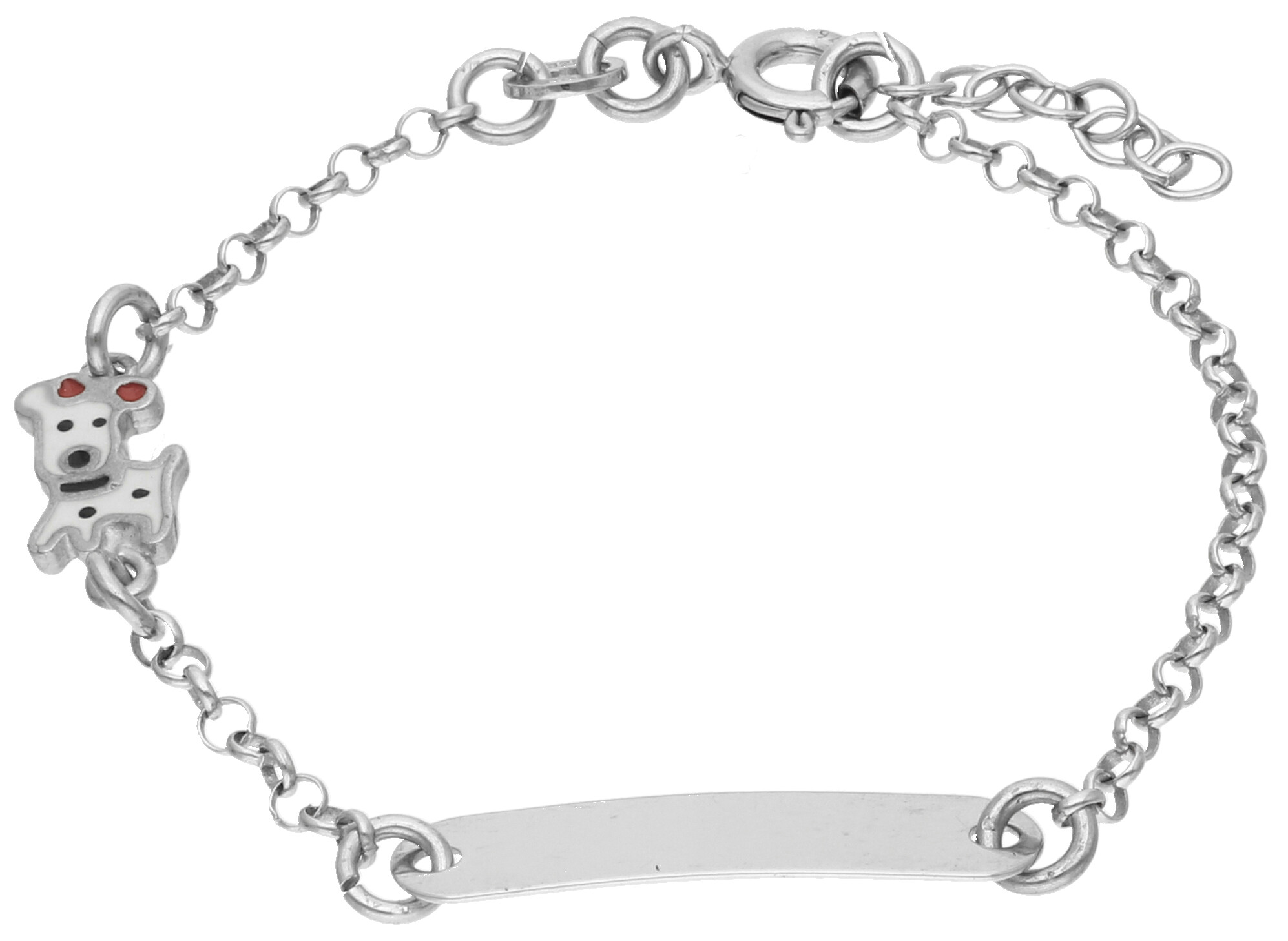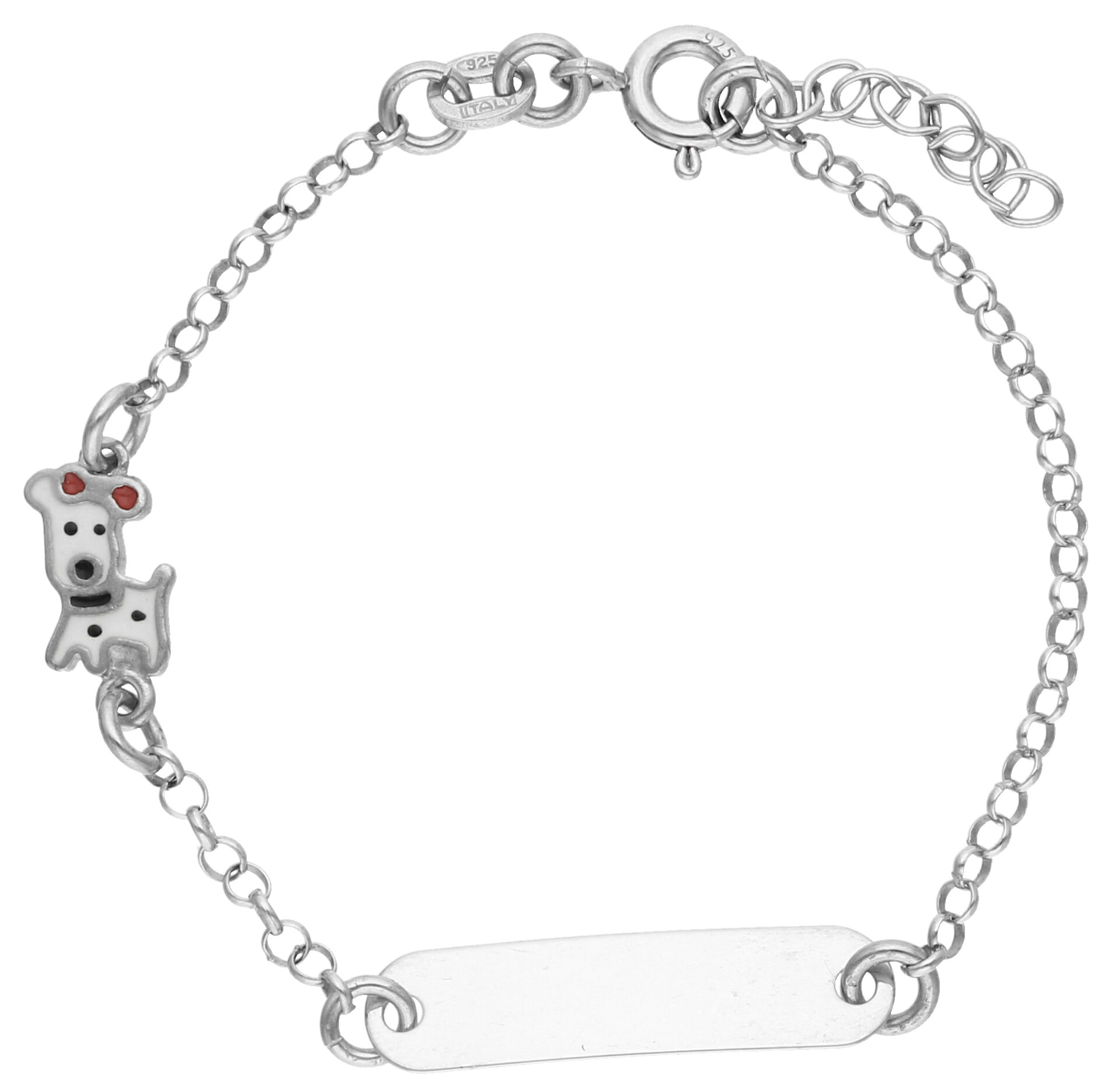 Dziecięca bransoletka z blaszką i motywem pieska to ozdoba, która może być wspaniałym podarunkiem dla dziewczynki. Regulowane zapięcie ułatwia dopasowanie biżuterii do nadgarstka, a delikatny łańcuszek jest wygodny i subtelny.