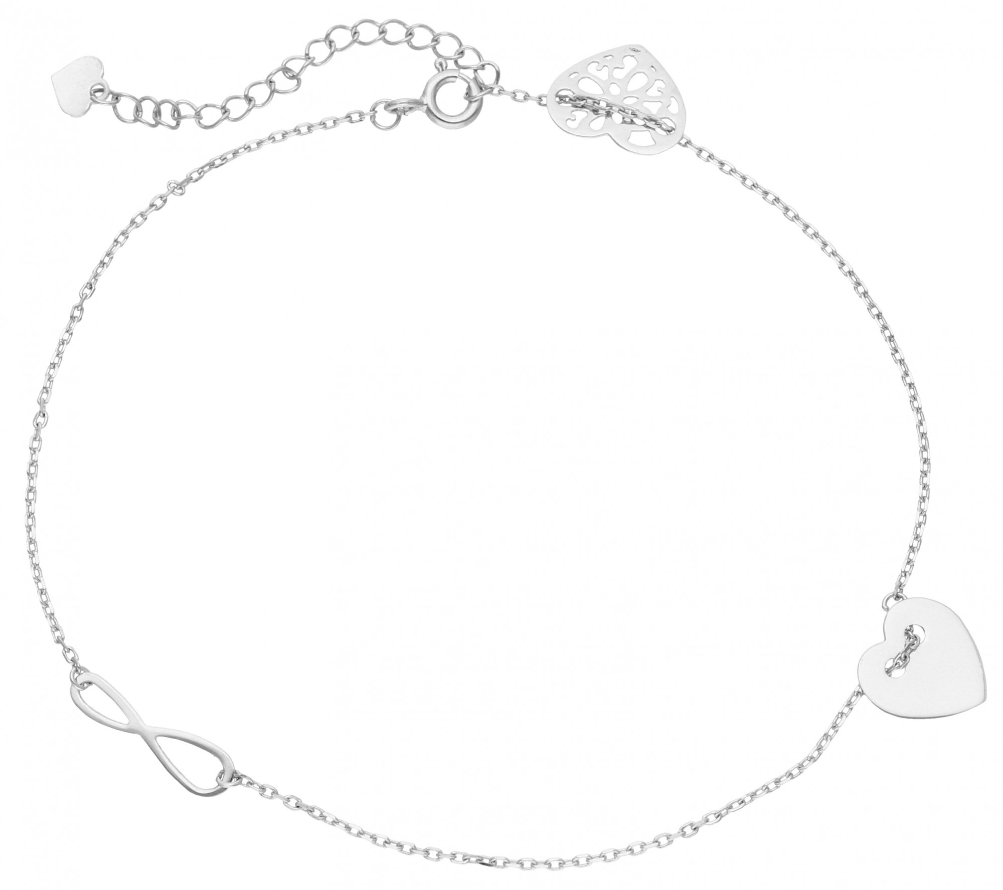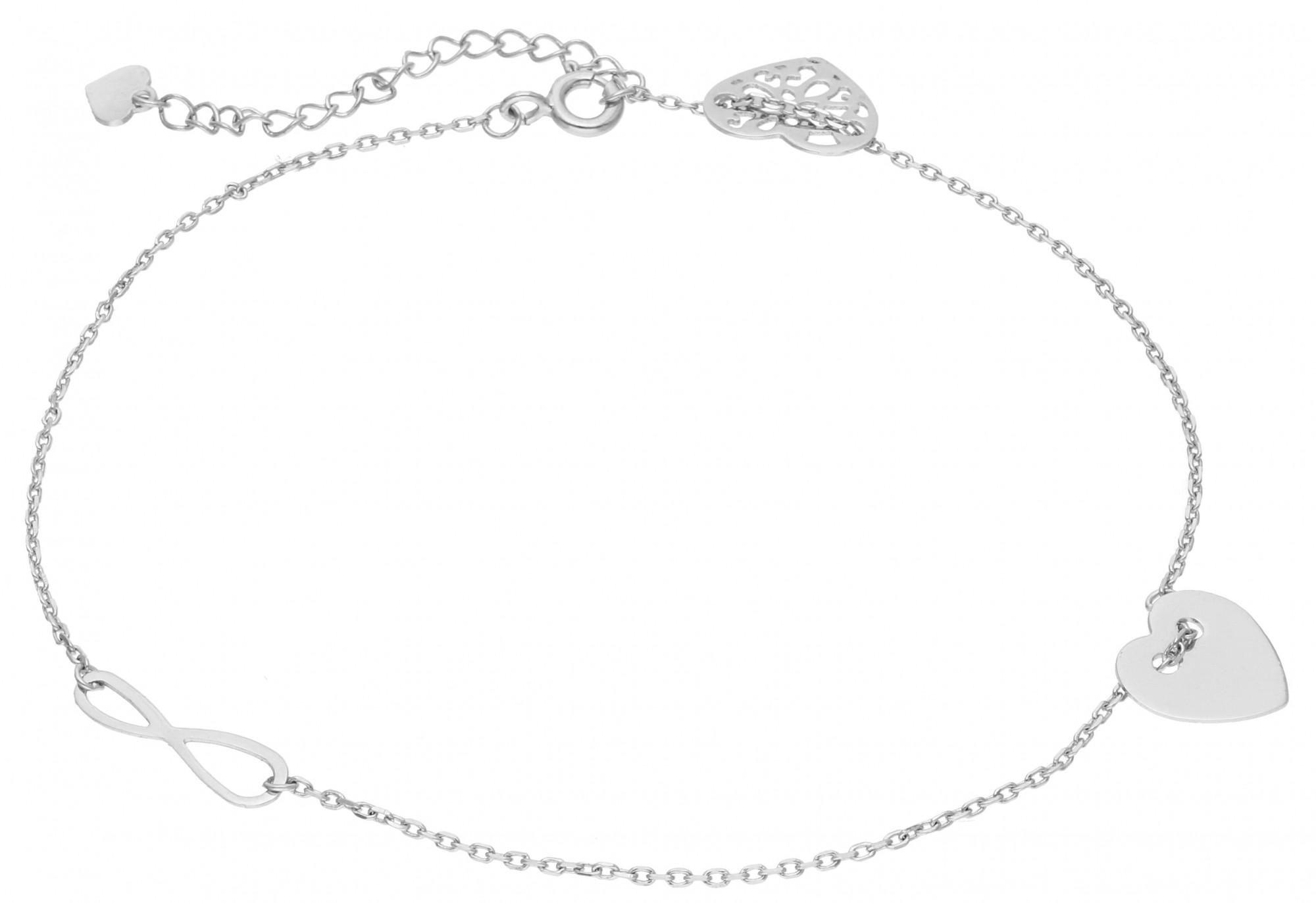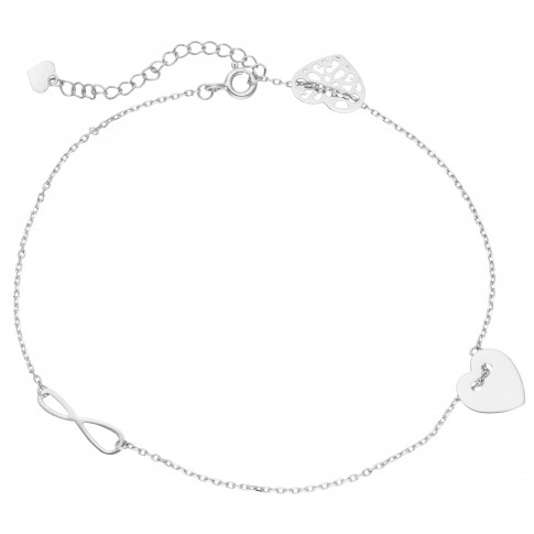 Lubisz niebanalne, modne dodatki? Srebrna bransoletka na kostkę z symbolem nieskończoności i serduszkami to wymarzony dodatek na lato! Biżuteria w nietypowym miejscu przyciąga wzrok i intryguje, dodając całej stylizacji kobiecego, niezwykle zmysłowego charakteru. Regulowane zapięcie daje pewność, że ozdoba dopasuje się idealnie!