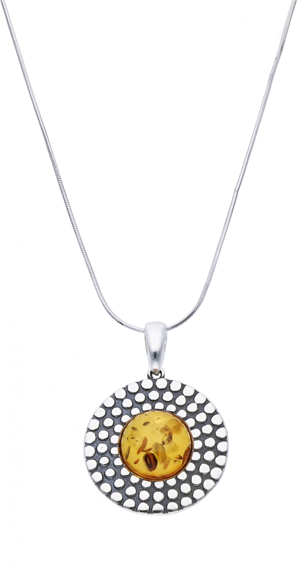 Okrągła zawieszka z centralnie osadzonym bursztynem zwraca uwagę ponadczasową formą. Niewielka ozdoba idealnie dopasuje się do kreacji w stylu etno czy boho, może być także ciekawym akcentem w codziennych i naturalnych stylizacjach. To biżuteria wysokiej jakości (srebro próby 925), ozdobiona bursztynem bałtyckim, która doda szyku każdej kreacji i podkreśli styl swojej właścicielki.