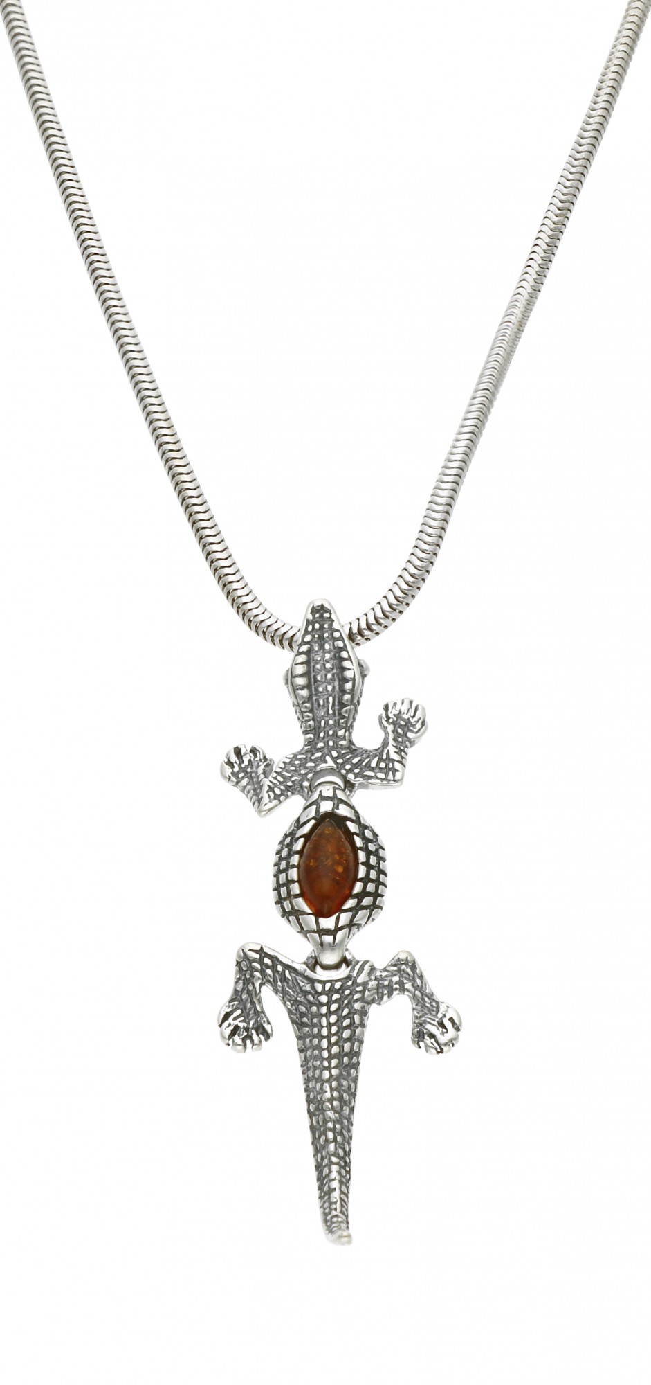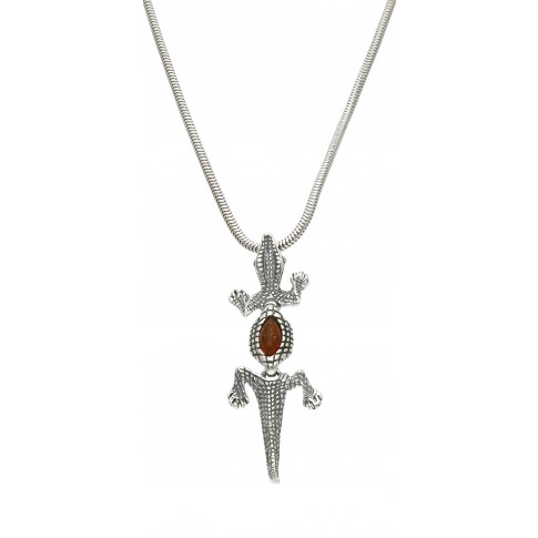 Efektowna i oryginalna - zawieszka z jaszczurką nie ma sobie równych! Misternie wykonane łuski i dodatek w postaci bursztynu sprawiają, że ozdoba robi wrażenie i z powodzeniem może stać się podstawą dla różnych stylizacji. Wybierz dłuższy łańcuszek, jednolitą bluzkę lub tunikę i w pełni wyeksponuj piękną biżuterię!