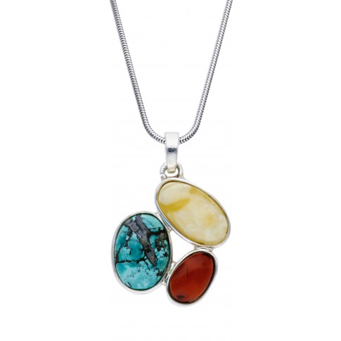 Piękna zawieszka z bursztynami i turkusem oprawionymi w srebro (próba 925) to wyjątkowy akcent kolorystyczny do Twoich stylizacji! Niebanalna forma wyzwala kreatywność i pomaga nadać stylizacjom niepowtarzalnego charakteru. Świetnie sprawdzi się jako uzupełnienie jesienno-zimowych stylizacji, którym doda energii i barw.