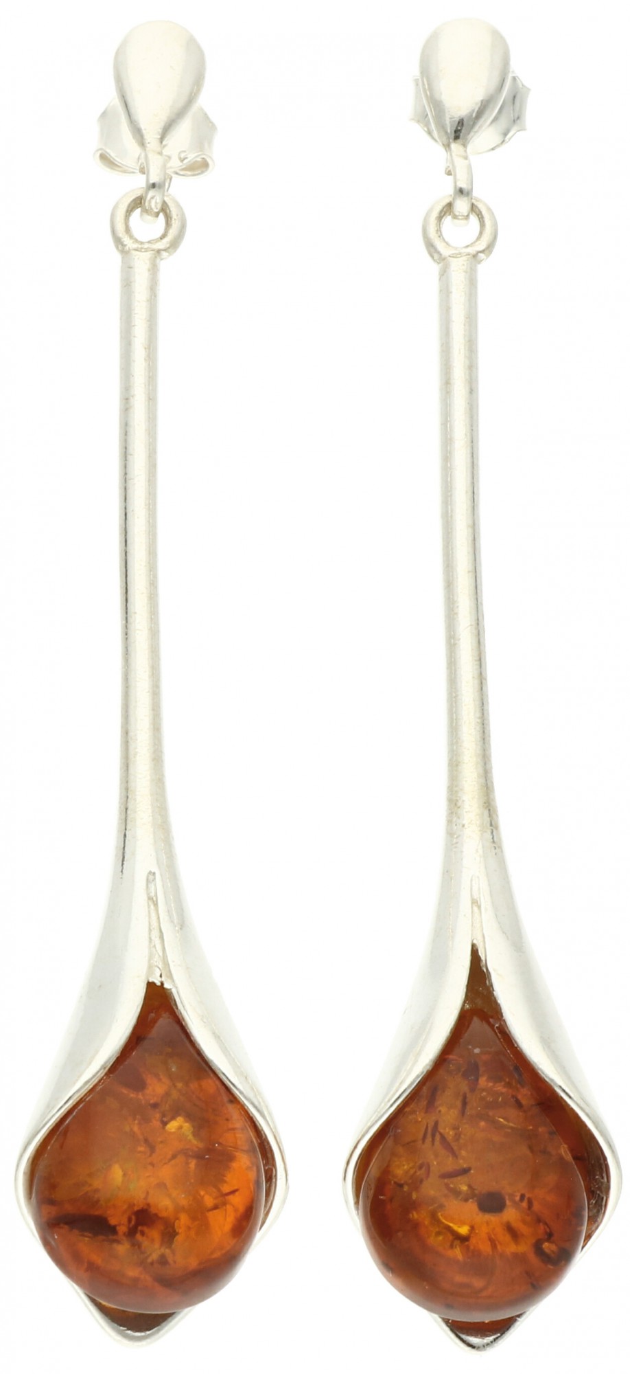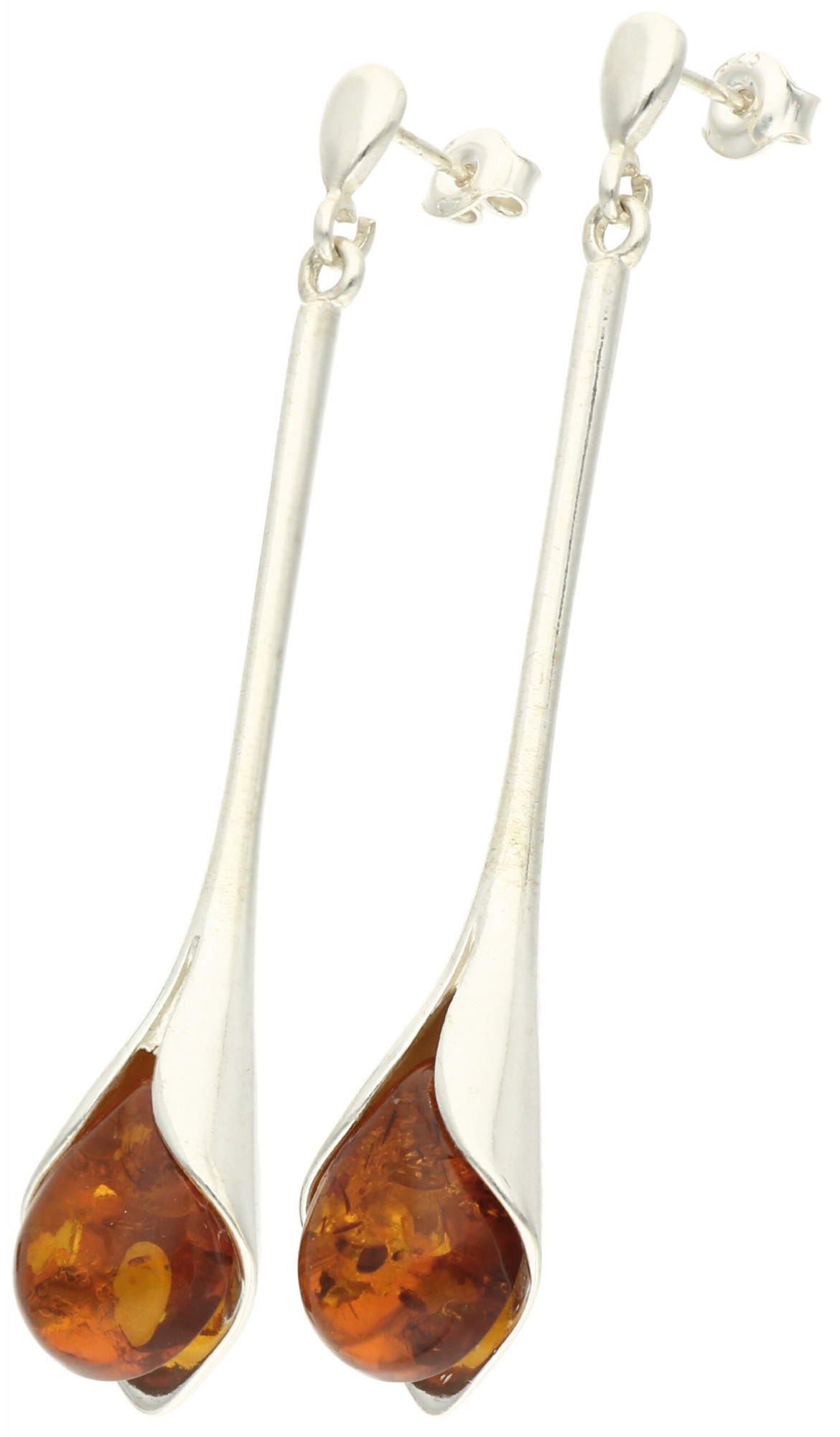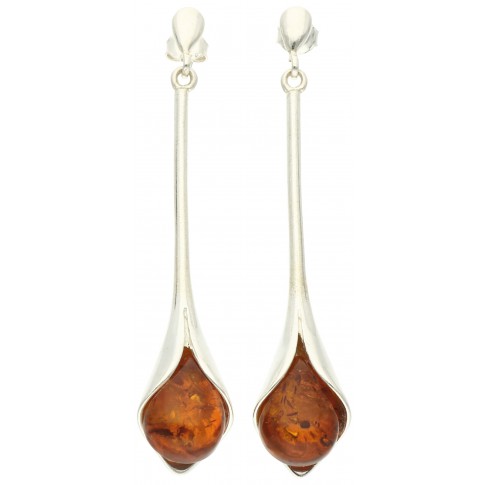 Srebrne kolczyki o wydłużonym kształcie, z dodatkiem bursztynu, to gustowna ozdoba o oryginalnym wyglądzie. Prosta forma biżuterii będzie doskonałym wyborem dla nowoczesnych kobiet, a bursztyn o głębokim odcieniu sprawi, że ozdoba wyróżni się na tle innych.