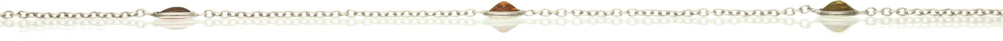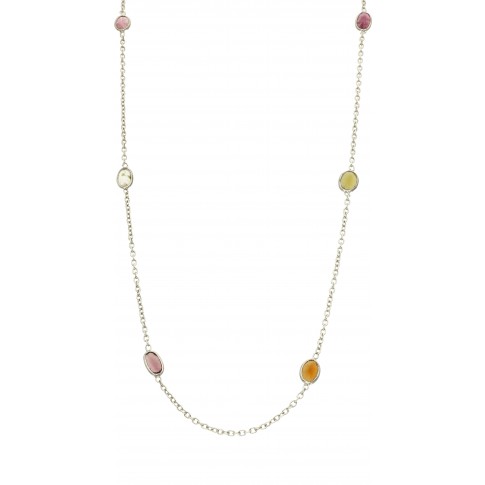 Różnobarwne turmaliny rozmieszczone na subtelnym, srebrnym łańcuszku to wyjątkowo kobieca biżuteria. Ozdoba zachwyca wyszukaną kolorystyką i delikatnością. Będzie pięknym, bezpretensjonalnym detalem, który doskonale uzupełni Twoje stylizacje. Może także stanowić wyjątkowy prezent dla bliskiej osoby.