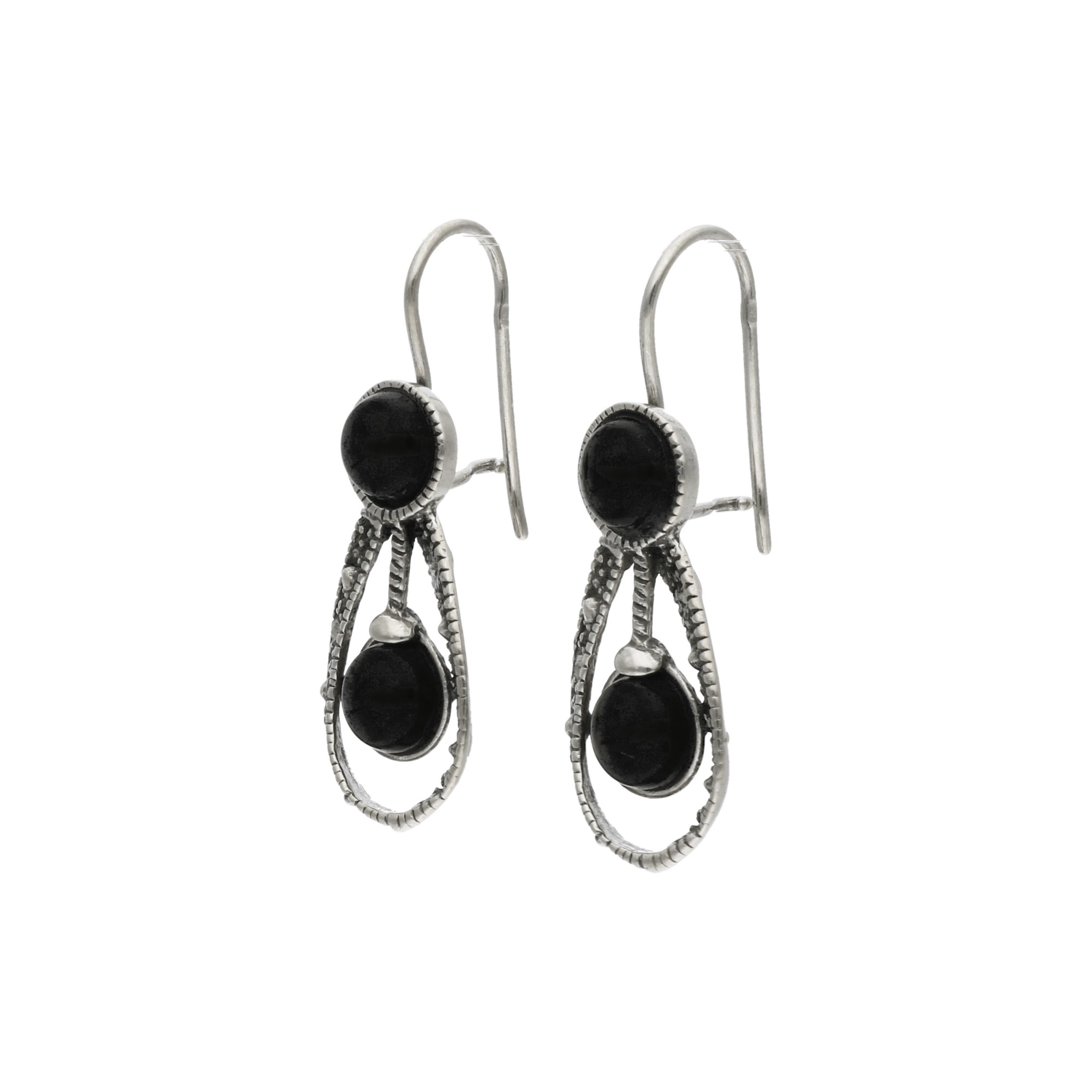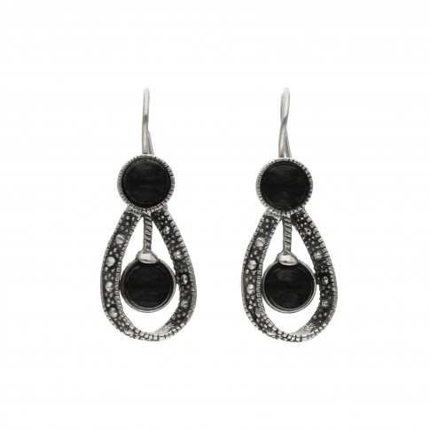 Wyjątkowe wiszące kolczyki od razu zwracają uwagę swoim niepowtarzalnym projektem. Kompozycja onyksów i markazytów prezentuje się tajemniczo i kusi głębią czerni. Biżuteria może być doskonałym uzupełnieniem różnych stylizacji i niezawodnym sposobem na podkreślenie własnego stylu.