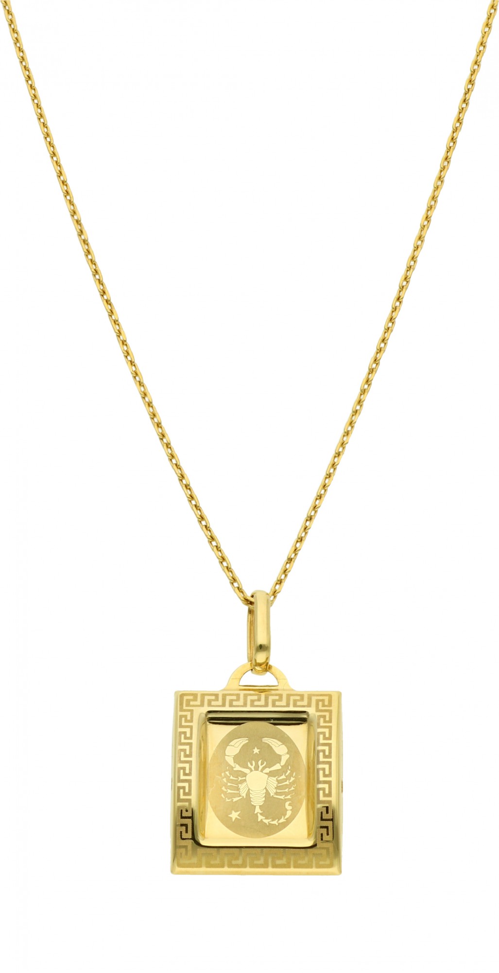 Intrygująca zawieszka z zodiakalnym skorpionem to biżuteria dla kobiet i mężczyzn. Została w całości wykonana z żółtego złota i ozdobiona motywem drogi greckiej. To efektowny dodatek pełen symboli i znaczenia, który może towarzyszyć Ci każdego dnia.