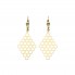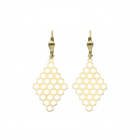Kolczyki w kształcie rombów, z ażurowym wzorem przypominającym plaster miodu, to oryginalna biżuteria dla kobiet, które lubią się wyróżniać. Ozdoba jest w całości wykonana z żółtego złota, a bezpieczne zapiecie (angielskie zatrzaskowe) zapobiega przypadkowemu zgubieniu.