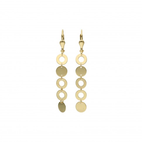 Wiszące kolczyki z żółtego złota przyciągają wzrok subtelnym, nowoczesnym projektem. Będą doskonałym uzupełnieniem casualowych stylizacji o każdej porze roku. Dodatkową zaletą jest bezpieczne zapięcie (angielskie zatrzaskowe), które zapobiega przypadkowemu zgubieniu ozdoby.