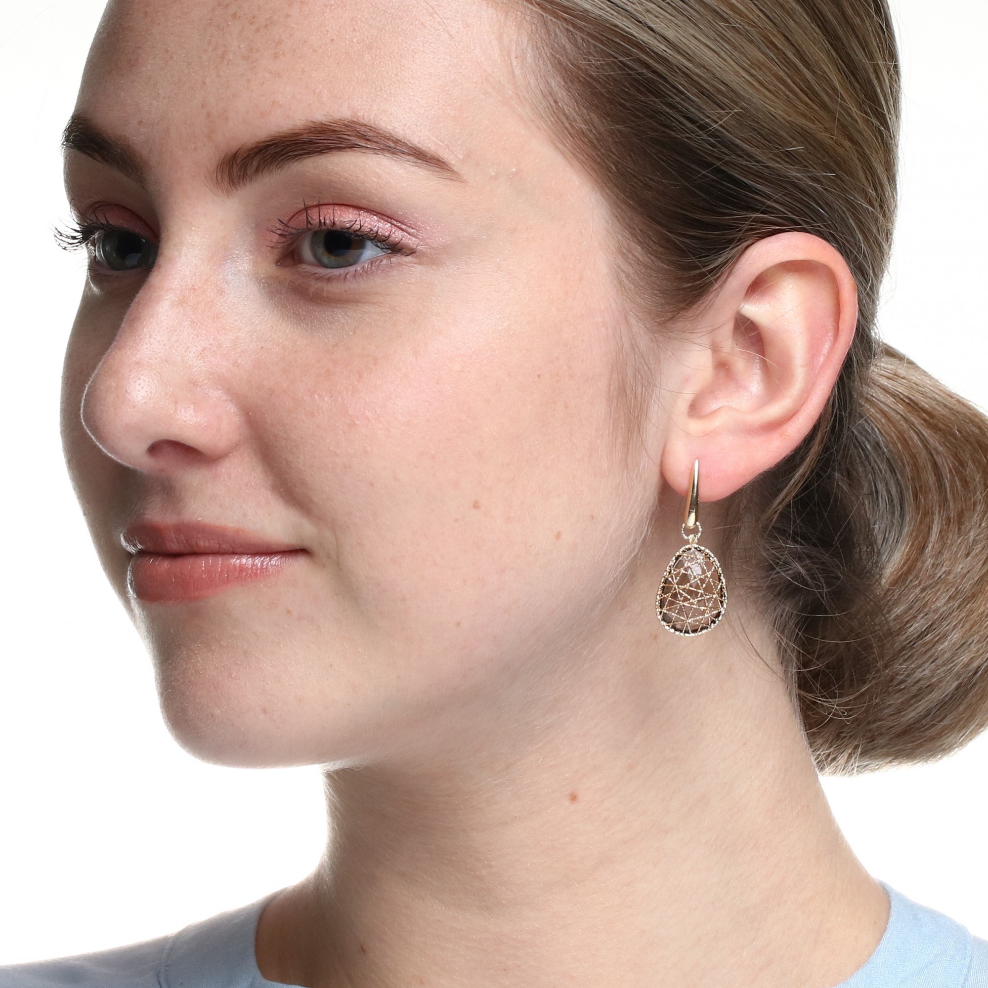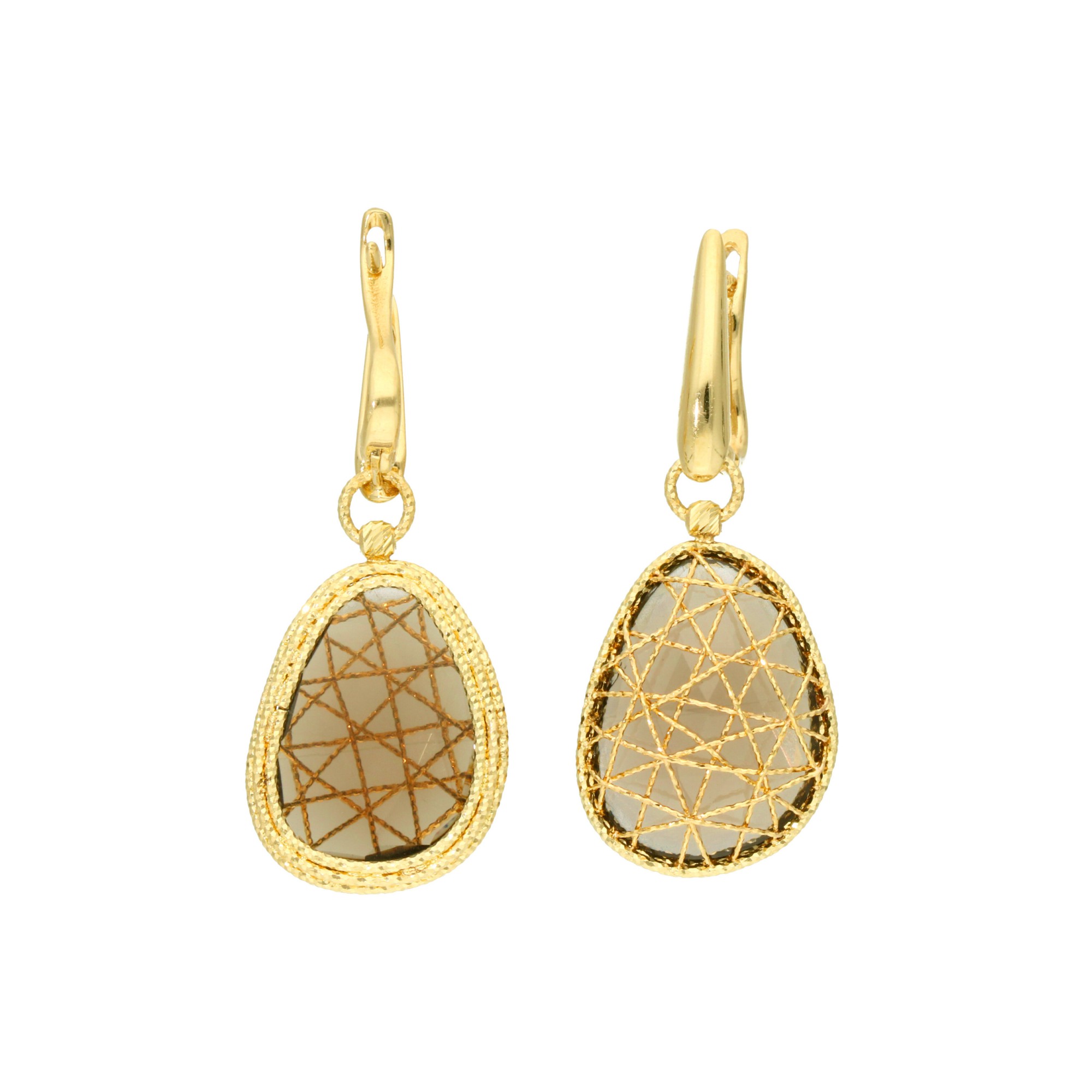 Złote kolczyki z pięknie szlifowanym kwarcytem. Plecionka z karbowanego drutu nadaje niepowtarzalności i oryginalnego stylu.