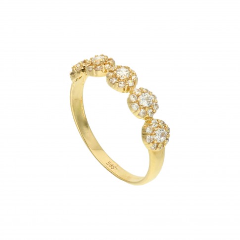 Oryginalny pierścionek ozdobiony cyrkoniami zwraca uwagę niebanalnym projektem. To pełna szyku, luksusowa biżuteria wysokiej klasy. Blask cyrkonii pięknie podkreśla żółte złoto, a precyzja wykonania świadczy o prawdziwym kunszcie sztuki jubilerskiej.