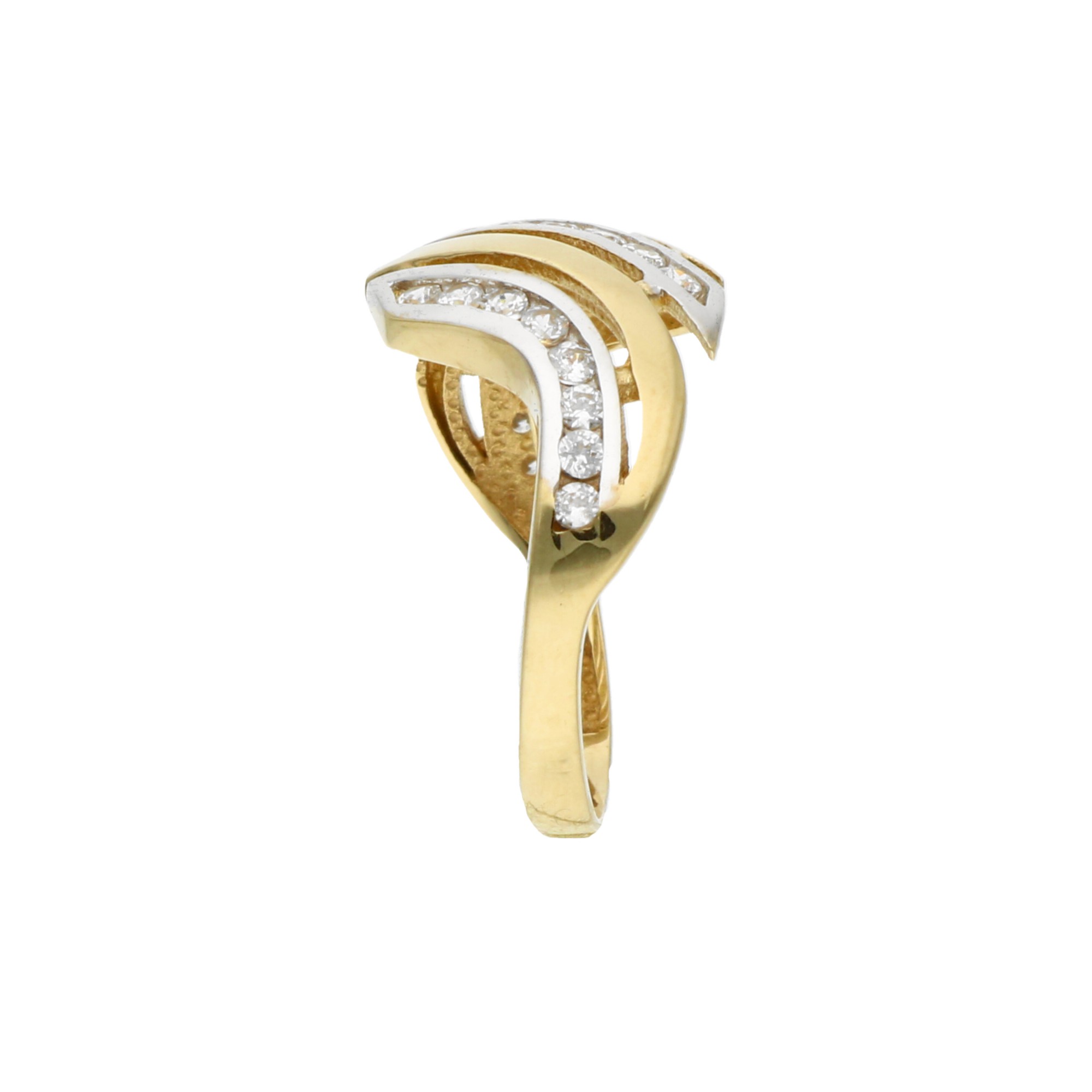 Gustowny złoty pierścionek, ozdobiony maleńkimi, przezroczystymi cyrkoniami, to intrygujący dodatek. Świetnie sprawdzi się u kobiet, które uwielbiaią podkreślać swój styl i chętnie wybierają niepowtarzalną biżuterię. Ażurowe fale dodają ozdobie lekkości i klasy.