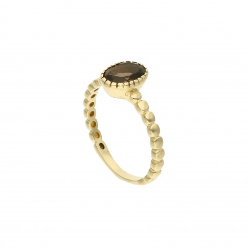 Nasz pierścionek zwraca uwagę nietypowym kamieniem - kwarcem dymnym o pięknym, głębokim odcieniu. Całości dopełnia oryginalnie zdobiona obrączka, dzięki której biżuteria wyróżnia się na tle innych ozdób. To jednocześnie skromny i niepowtarzalny projekt, doskonały do eleganckich stylizacji.