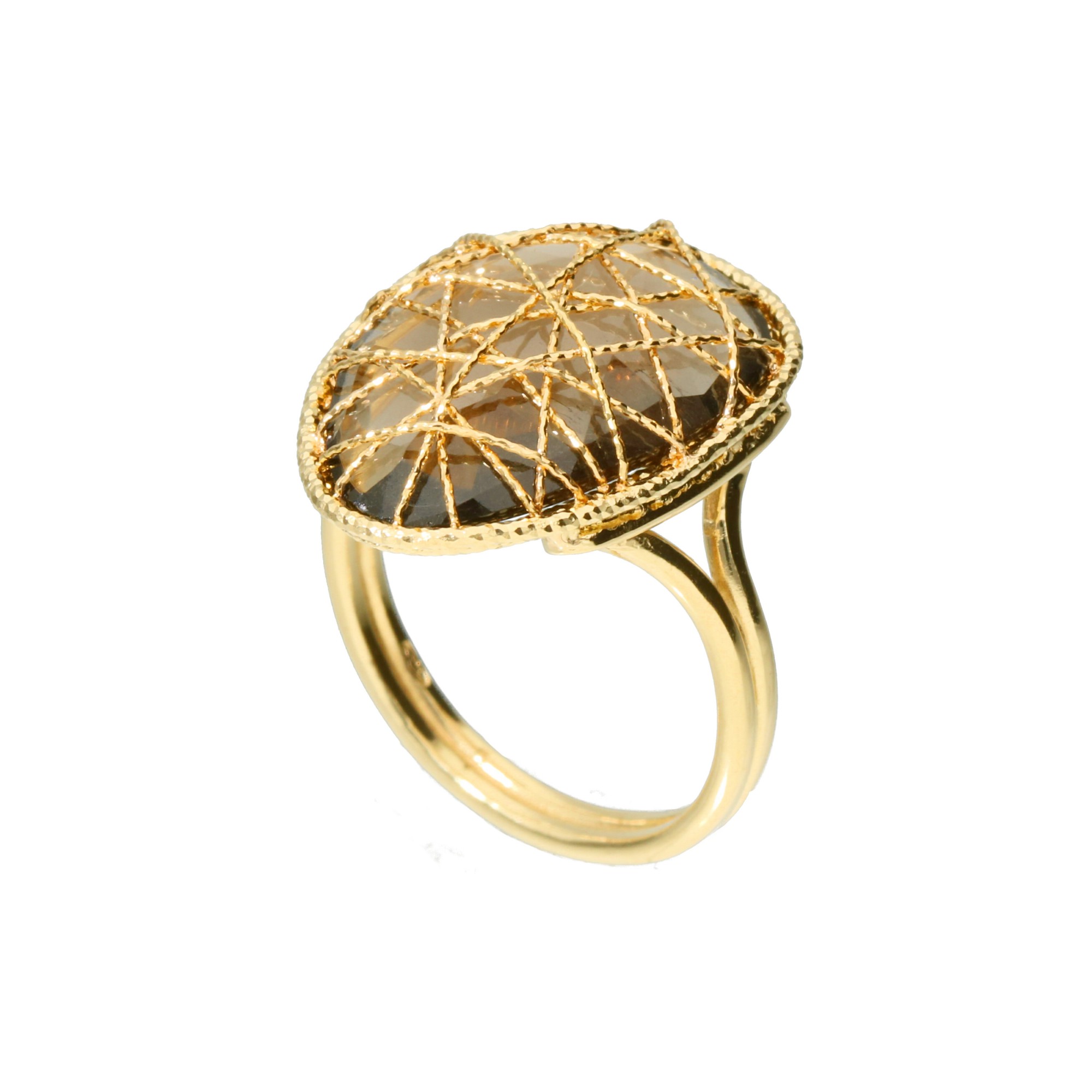 Złoty pierścionek z pięknie szlifowanym kwarcytem. Plecionka z karbowanego drutu nadaje niepowtarzalności i oryginalnego stylu.