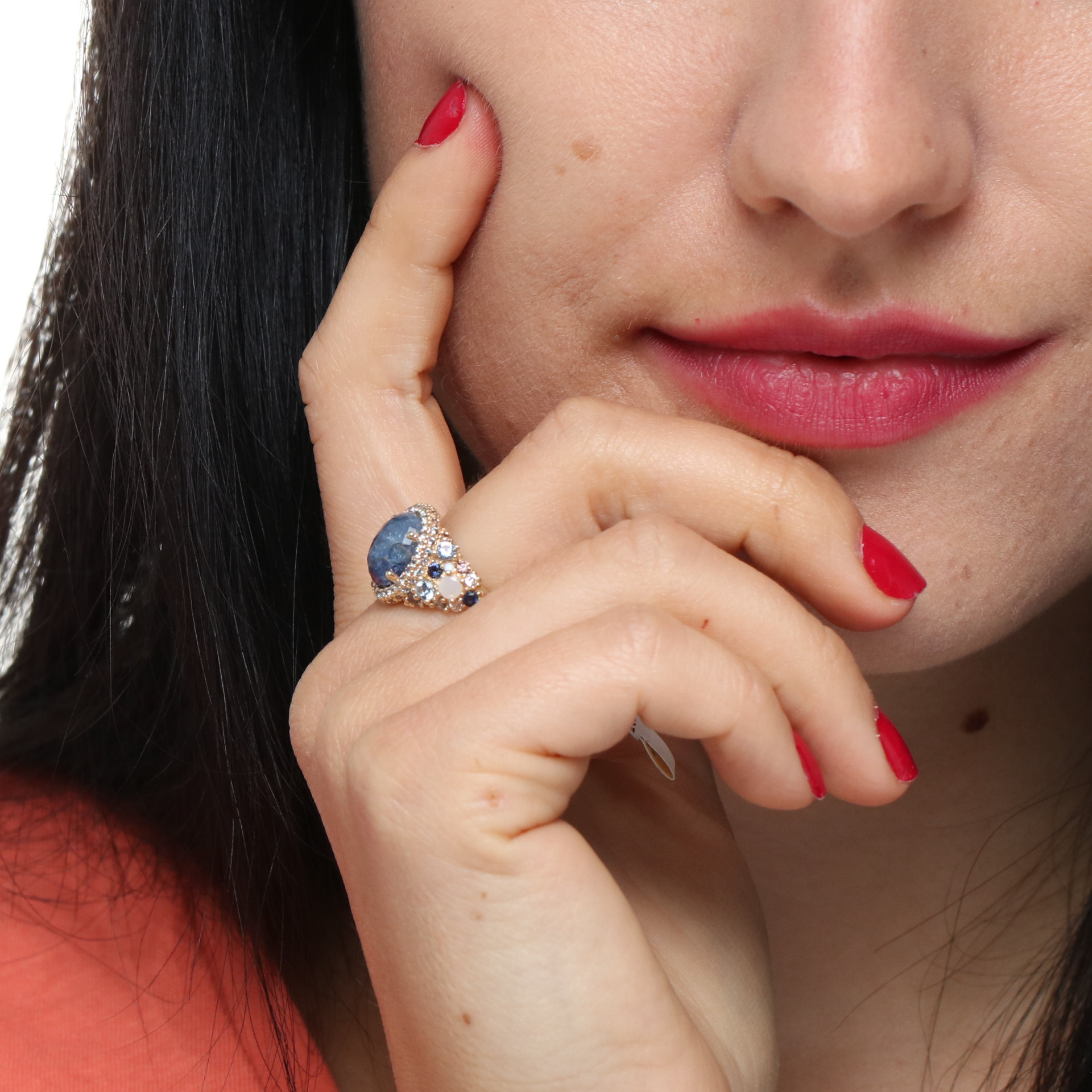 Szafir w otoczeniu cyrkonii, w barokowym pierścionku ze złota, to ozdoba, która zachwyci wiele pokoleń. Ma doskonałe warunki, by stać się pamiątką rodzinną albo kunsztownym prezentem dla miłośniczki okazałej biżuterii. Takich pierścionków nie spotyka się na co dzień, a ten - jest tutaj i czeka właśnie na Ciebie.